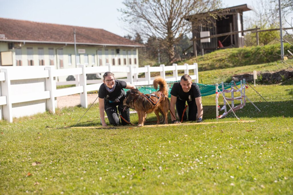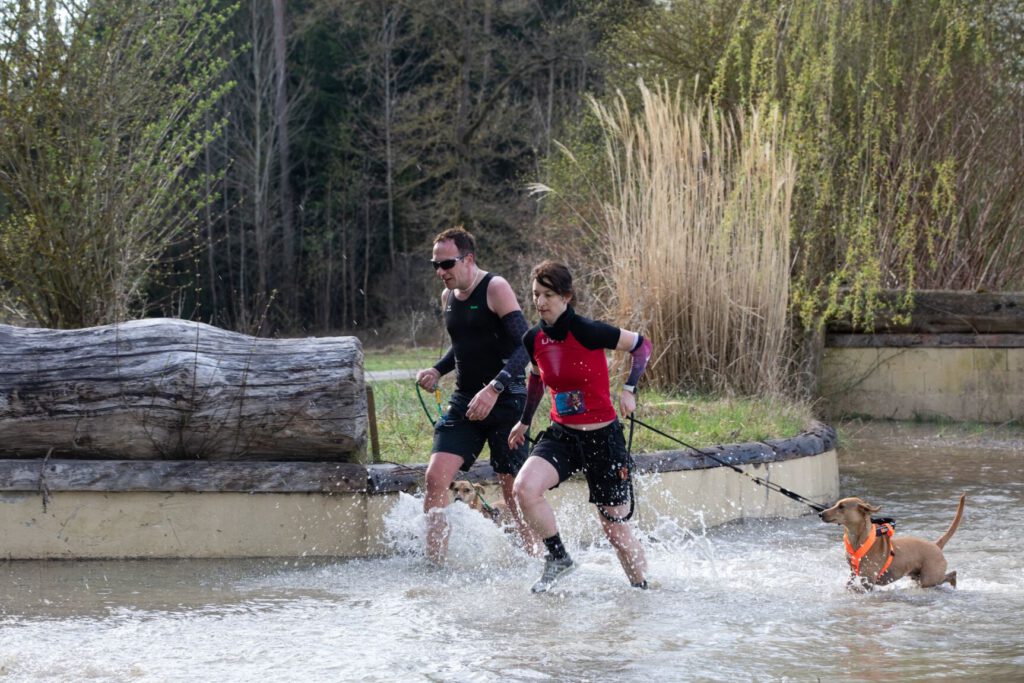 Das Wetter war an diesem Tag ideal: es blieb trocken und die Temperaturen waren angenehm – weder zu warm noch zu kalt, was die Bedingungen für Mensch und Hund perfekt machte. Die Strecke führte durch anspruchsvolle Geländetypen, von steilen Hügeln und tiefen Gruben bis hin zu Teichen und Hindernissen, die nicht nur die körperliche Ausdauer forderten, sondern auch den Teamgeist zwischen Hund und Halter auf die Probe stellten. Die Hindernisse auf der Strecke waren abwechslungsreich und stellten hohe Anforderungen an die Teamarbeit. Neben physischen Herausforderungen wie Steigungen, Schlammgruben und Kletterpassagen mussten die Teilnehmer auch ihre Hunde durch enge Netze und unwegsames Gelände navigieren, was das Teamgefühl weiter stärkte. Besonders hervorzuheben war der Ententeich, durch den nahezu alle Starter geschwommen sind. Dieses Hindernis sorgte dafür, dass Mensch und Hund bis auf die Haut durchnässt, aber dennoch mit einem Lächeln und stolz im Ziel ankamen. Nach dem Wettkampf versorgte sich die Gruppe am Foodtruck mit Mittagessen und wartete gespannt auf die Siegerehrung. Ein besonderes Highlight des ersten Wettkampftages war der Erfolg von Benedikt und seinem Hund Bruno, die den 1. Platz in ihrer Kategorie erringen konnten. Ihr Durchhaltevermögen und die enge Zusammenarbeit wurden mit dem verdienten ersten Platz belohnt. Die Atmosphäre war entspannt und alle Teilnehmer, auch die, die nicht auf dem Podium landeten, waren stolz auf ihre Leistung und die ihrer Hunde. Nach der Siegerehrung ging es für die Gruppe noch zur Eisdiele, wo man gemeinsam den Erfolg und die erlebte Herausforderung feierte. Am Abend trafen sich alle wieder in der Pension zum gemeinsamen Abendessen und ließen den Tag ausklingen.