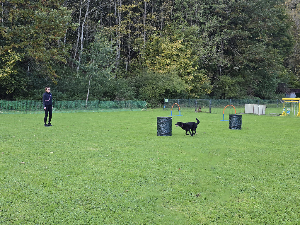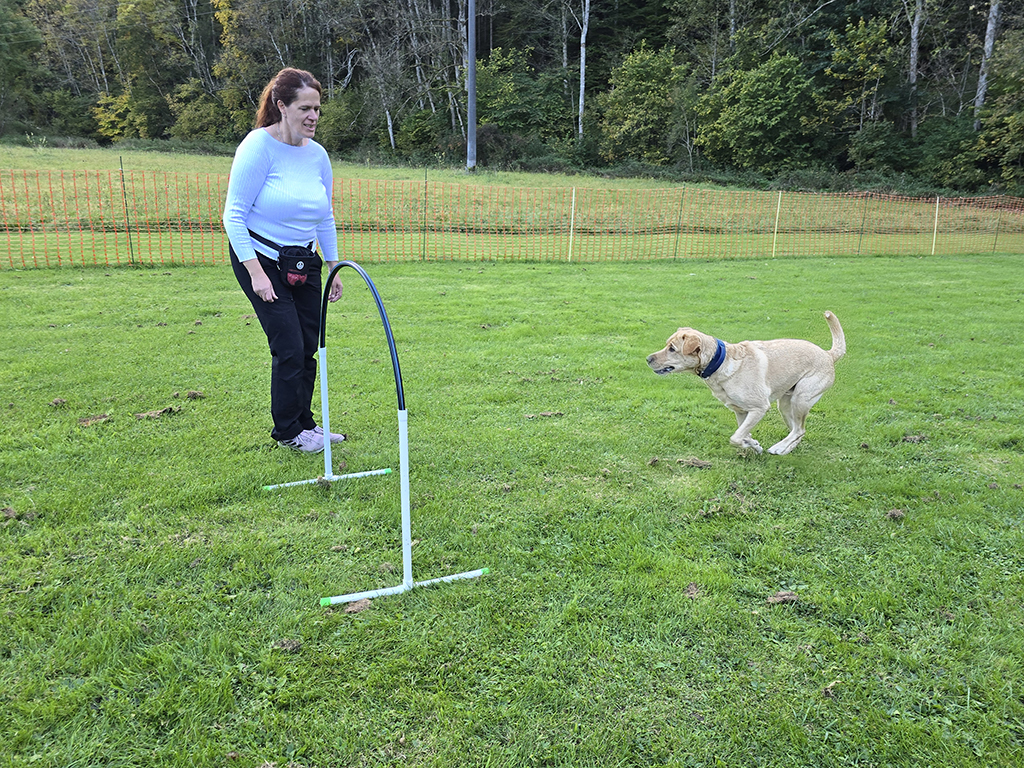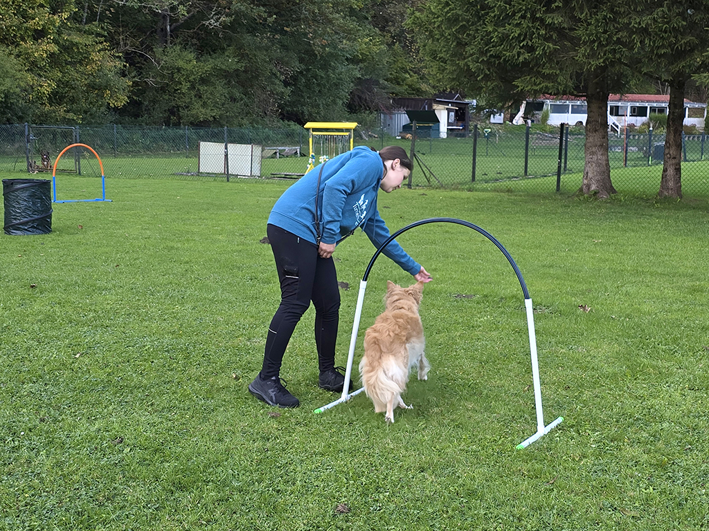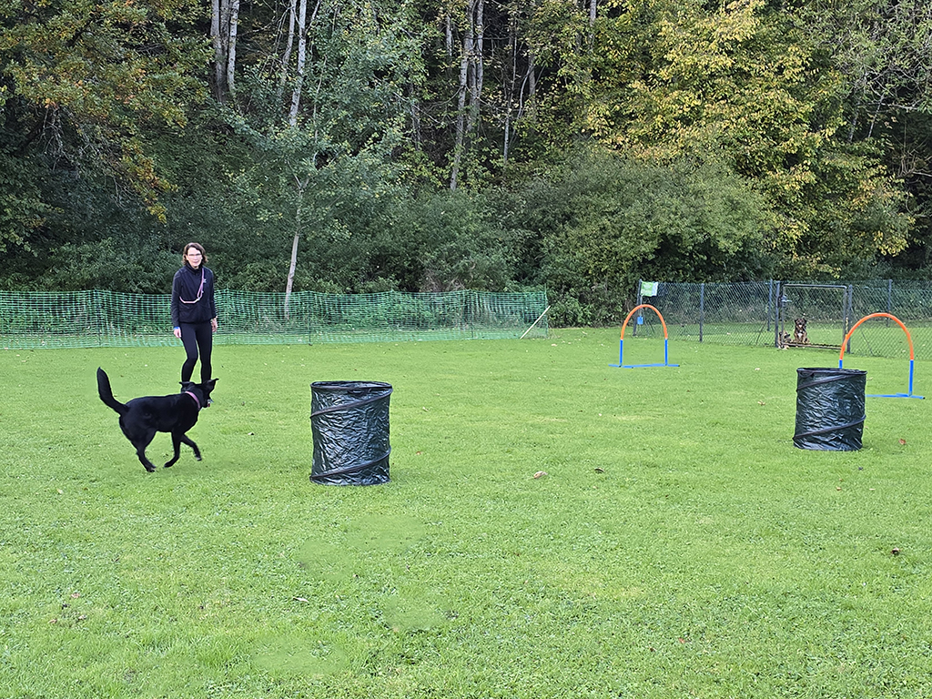 Bei Hoopers wird der Hund auf Distanz durch einen wechselnden Parcours aus Hoops, Tonnen, Gates und Tunnel geführt. Ziel ist es, ruhig und präzise zusammenzuarbeiten, es erfordert Konzentration und Feingefühl auf beiden Seiten.